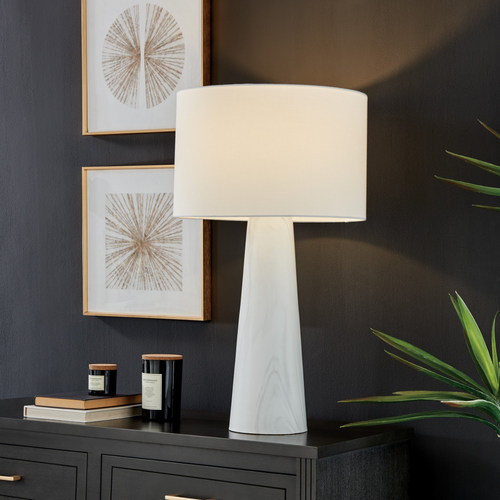 Crafted from a marble finish with circular white fabric shade, this elegant lamp features handcrafted details that lend it a unique touch. These fixtures act as sculptural pieces in a room, creating visual drama. Requires a Type A bulb (up to 100W max).